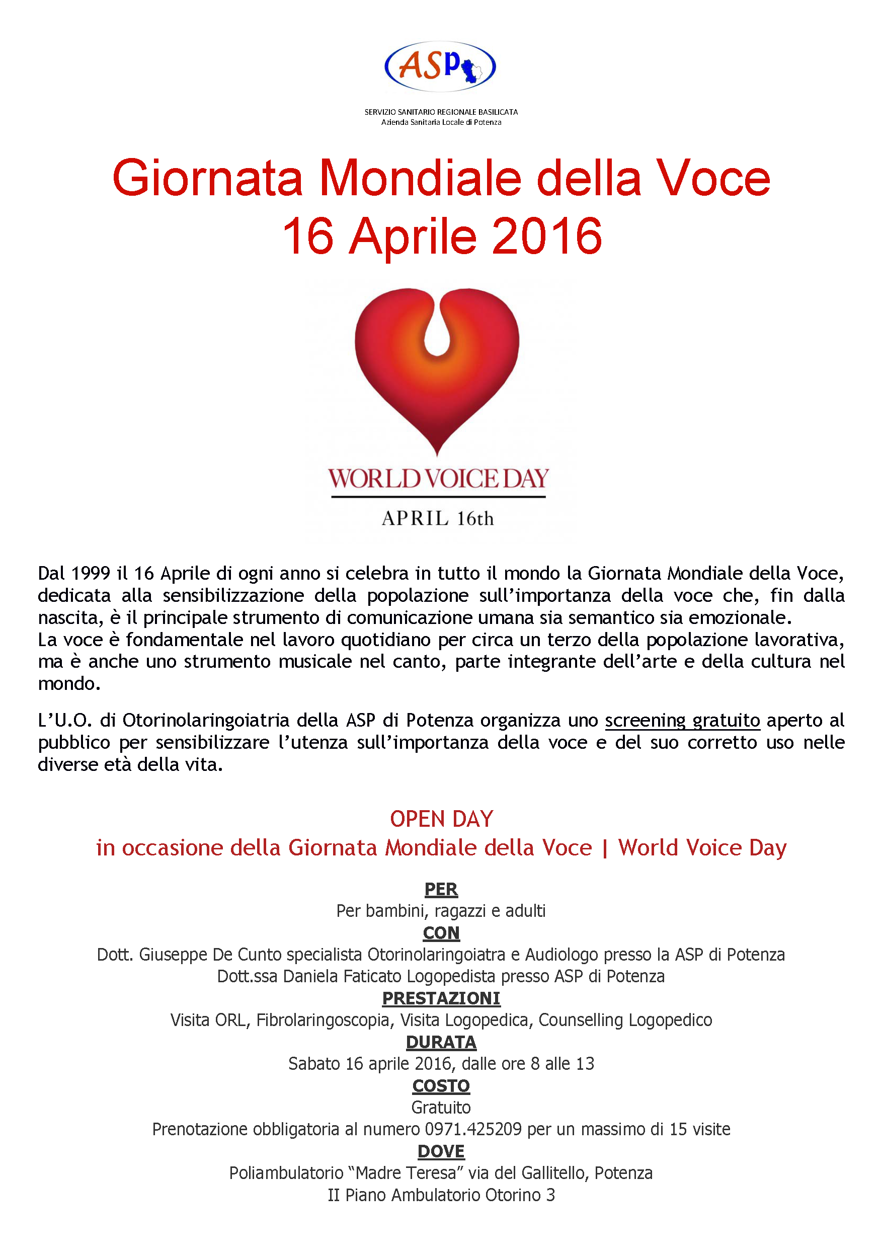 L’Azienda Sanitaria di Potenza aderisce alla Giornata Mondiale della Voce che si tiene il 16 aprile 2016 dalle ore 8,00 alle ore 13,00 presso il Poliambulatorio “Madre Teresa di Calcutta” in via del Gallitello a Potenza.